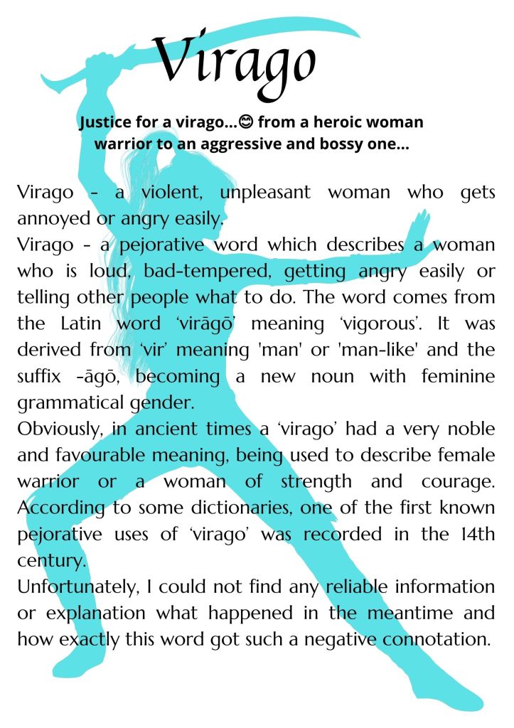 Obviously, in ancient times a ‘virago’ had a very noble and favourable meaning, being used to describe female warrior or a woman of strength and courage. According to some dictionaries, one of the first known pejorative uses of ‘virago’ was recorded in the 14th century.