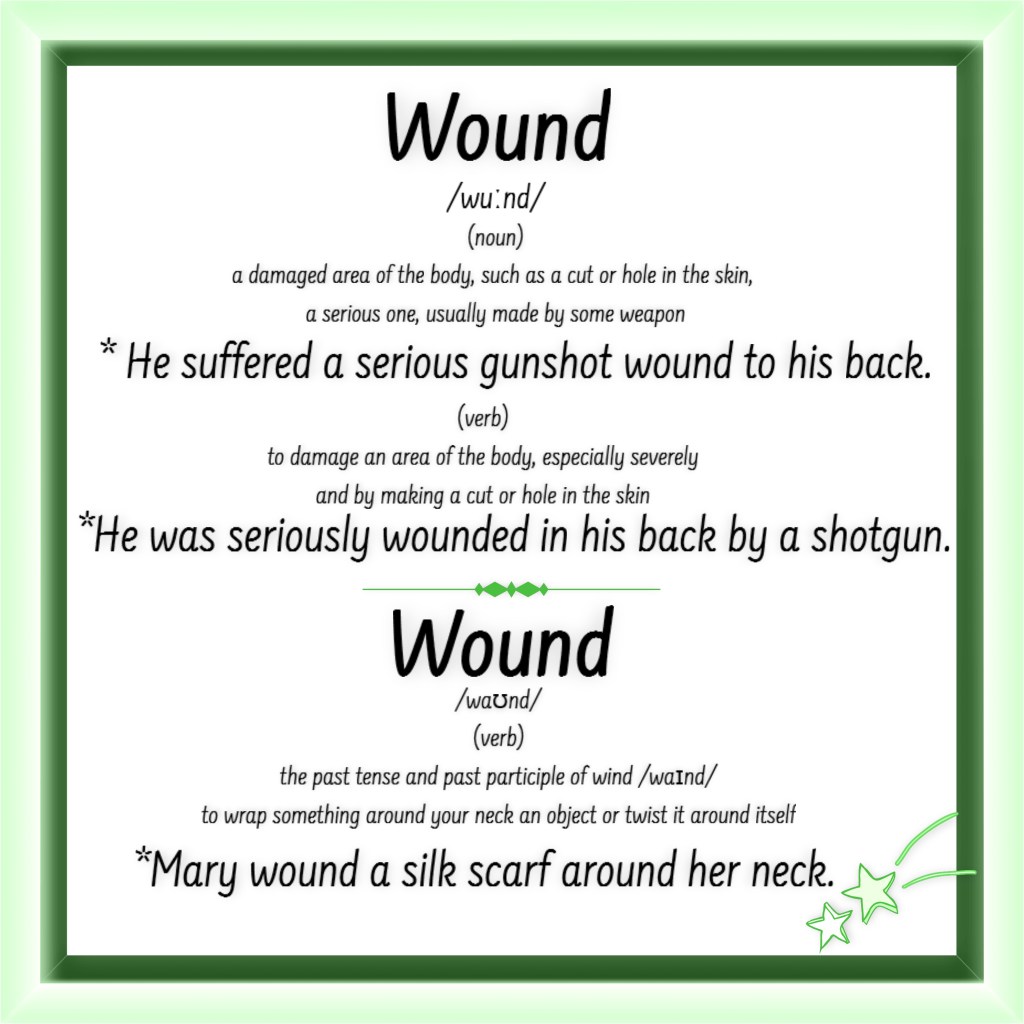 (noun) a damaged area of the body, such as a cut or hole in the skin, a serious one, usually made by some weapon: